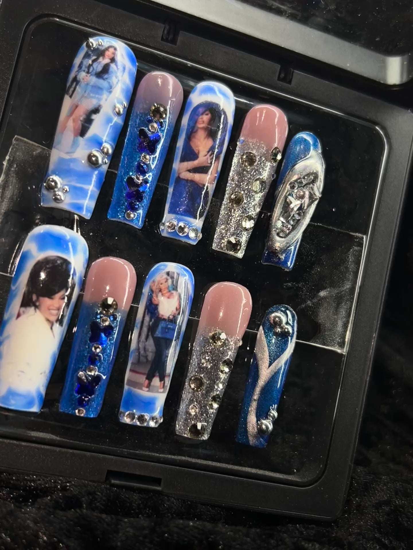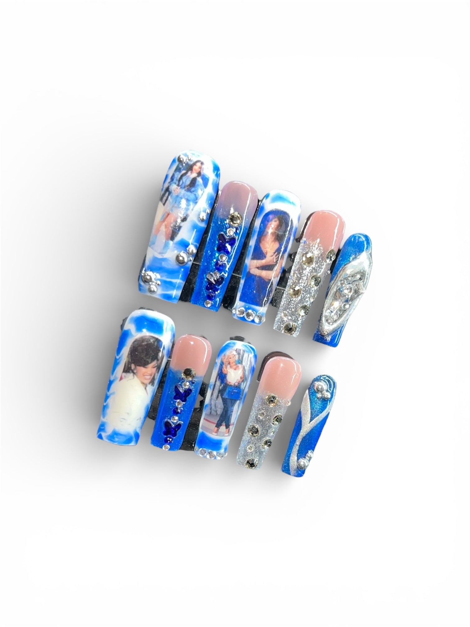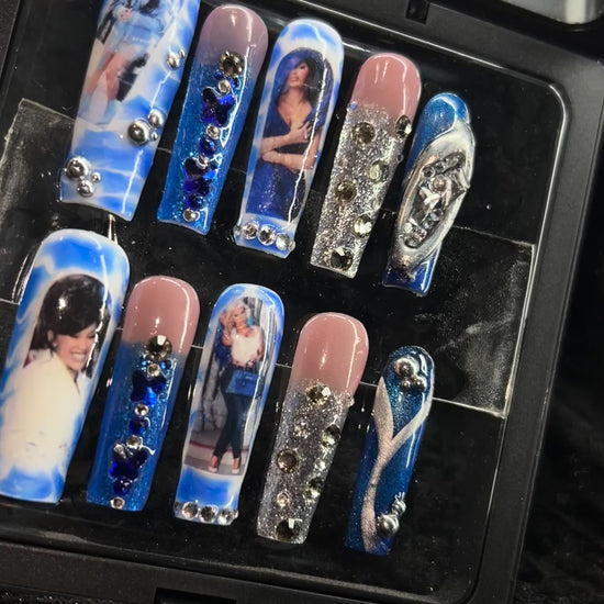 Step into the spotlight with Blue Bardi Fantasy, a crystal-covered tribute to the queen of drama. This icy blue set features Cardi-inspired photo decals, rhinestone detailing, and shimmering silver accents that hit different under concert lights. Long coffin nails with dramatic sparkle make this the perfect set for the Little Miss Drama Tour.