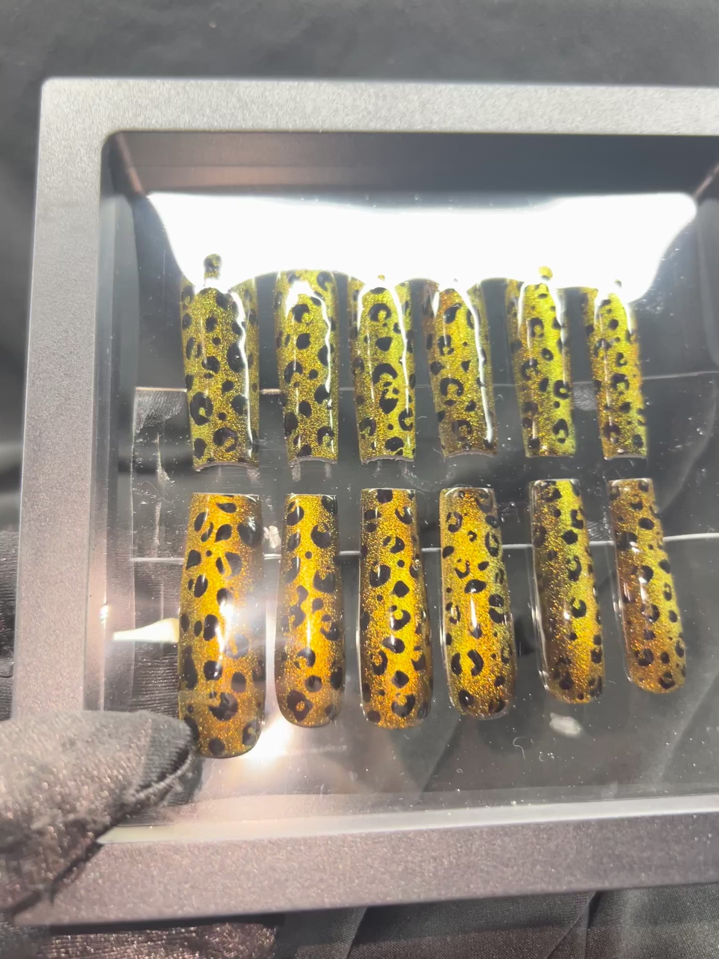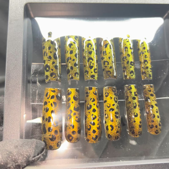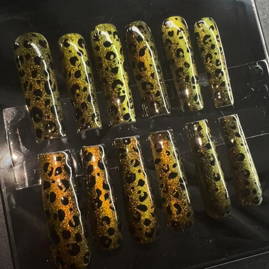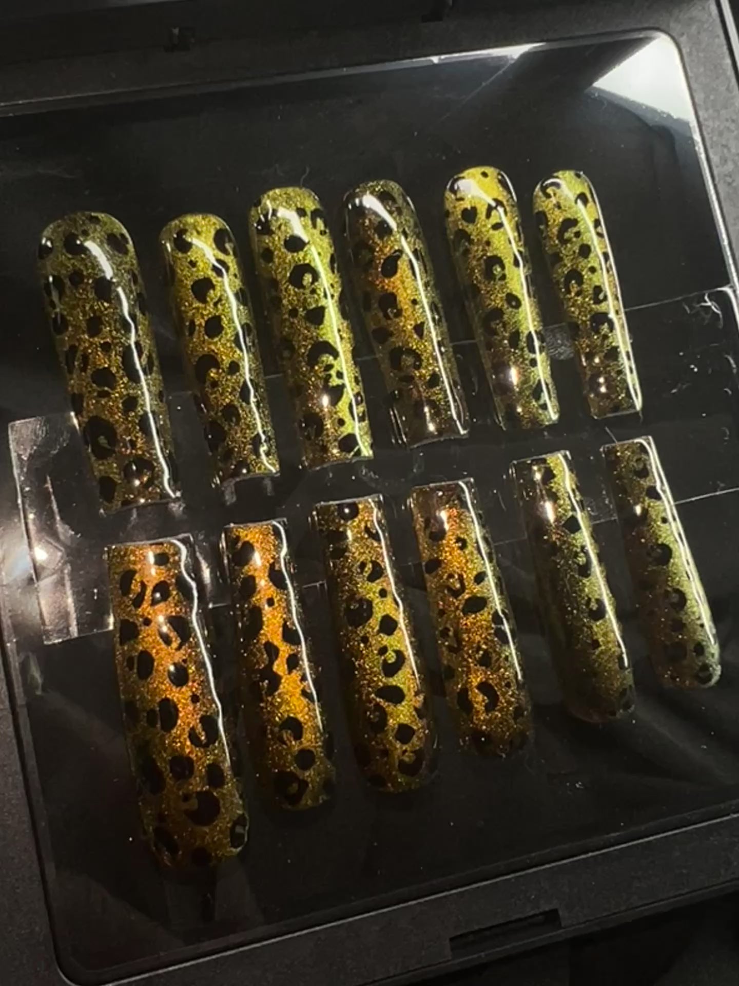 Turn up the heat this holiday season with Golden Leopard Luxe — a rich gold-to-bronze cat eye topped with bold hand-painted leopard print. This set blends wild glam with festive shine, perfect for Christmas parties, New Year’s Eve looks, or everyday slay.