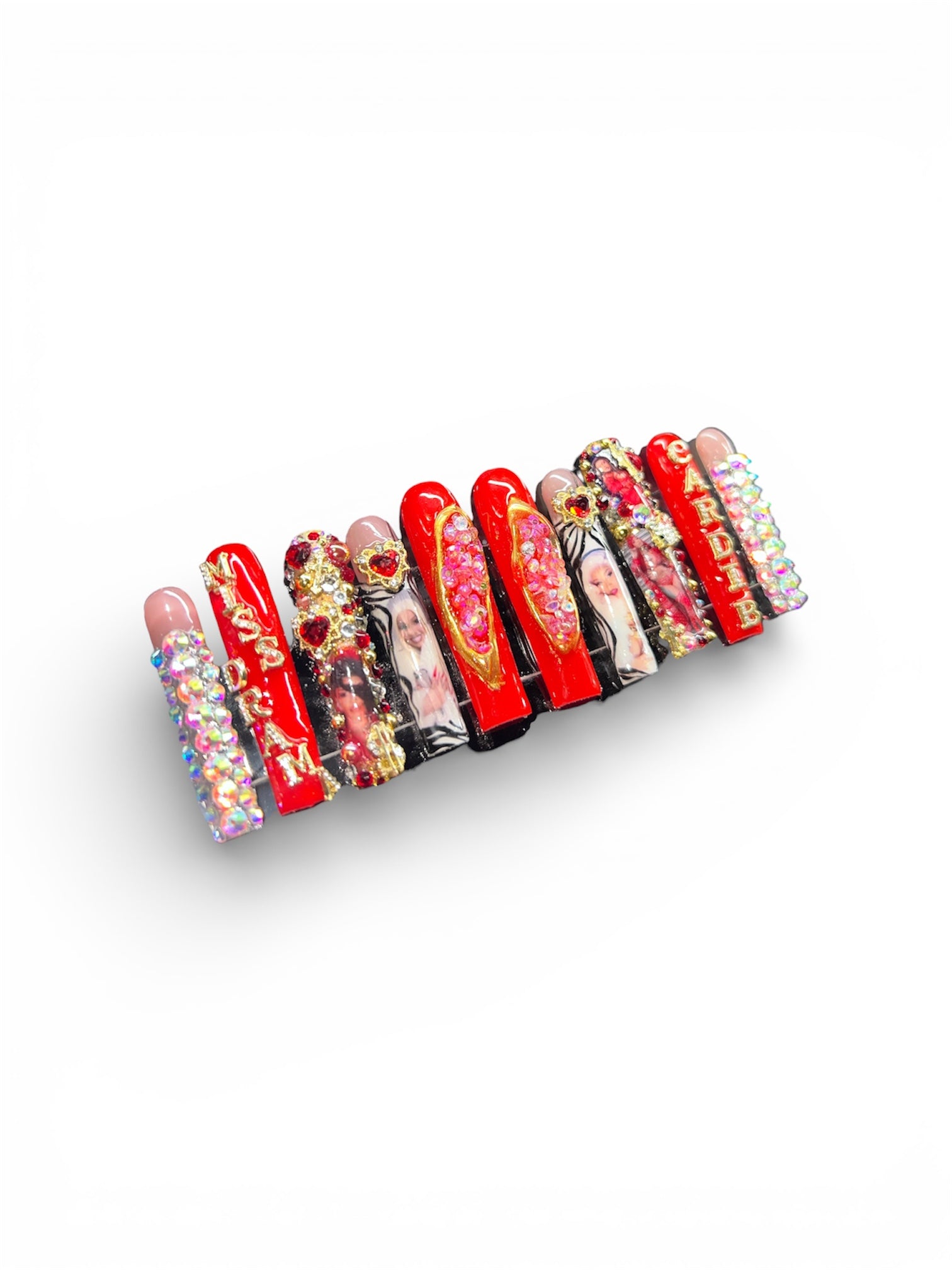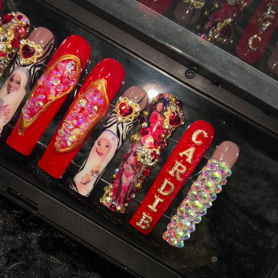 The ultimate showstopper. Miss Drama Deluxe is the crown jewel of the collection featuring oversized crystals, gold accents, and Cardi-inspired portrait nails. This dramatic red set is pure luxury and unapologetic glam.