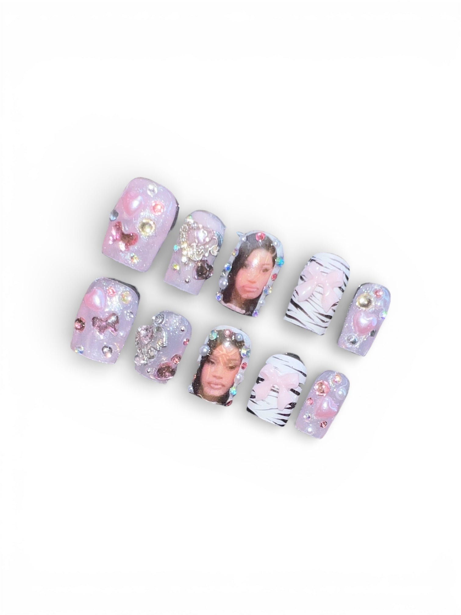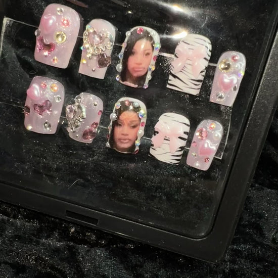 Soft but still savage. Pretty & Problematic mixes delicate pink shimmer with rhinestones, bows, and Cardi-inspired art. This shorter square set is perfect for fans who want glam without the extreme length.